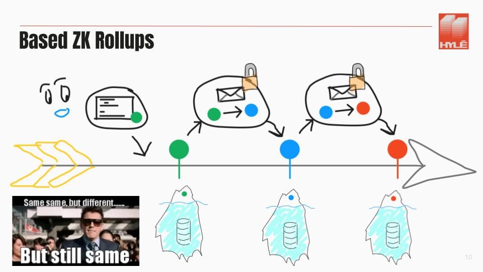 If you don’t do it with batches of blocks but with individual transactions, you end up with something that looks a lot like what I call a based ZK rollup: each transaction is just a ZK proof of a state transition. On the Layer 1, you maintain the state commitment for your application. That’s precisely how rollups work, and you could do a regular app that works like that… but you’ll have some issues.