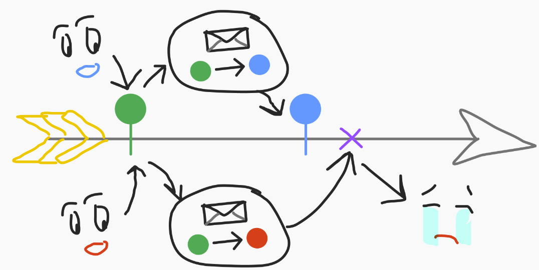 - The person on the upper timeline is faster than you because they've got a better computer or whatever. They send their transaction first, and at this point, your transaction will bounce: the proof of state transition no longer applies.